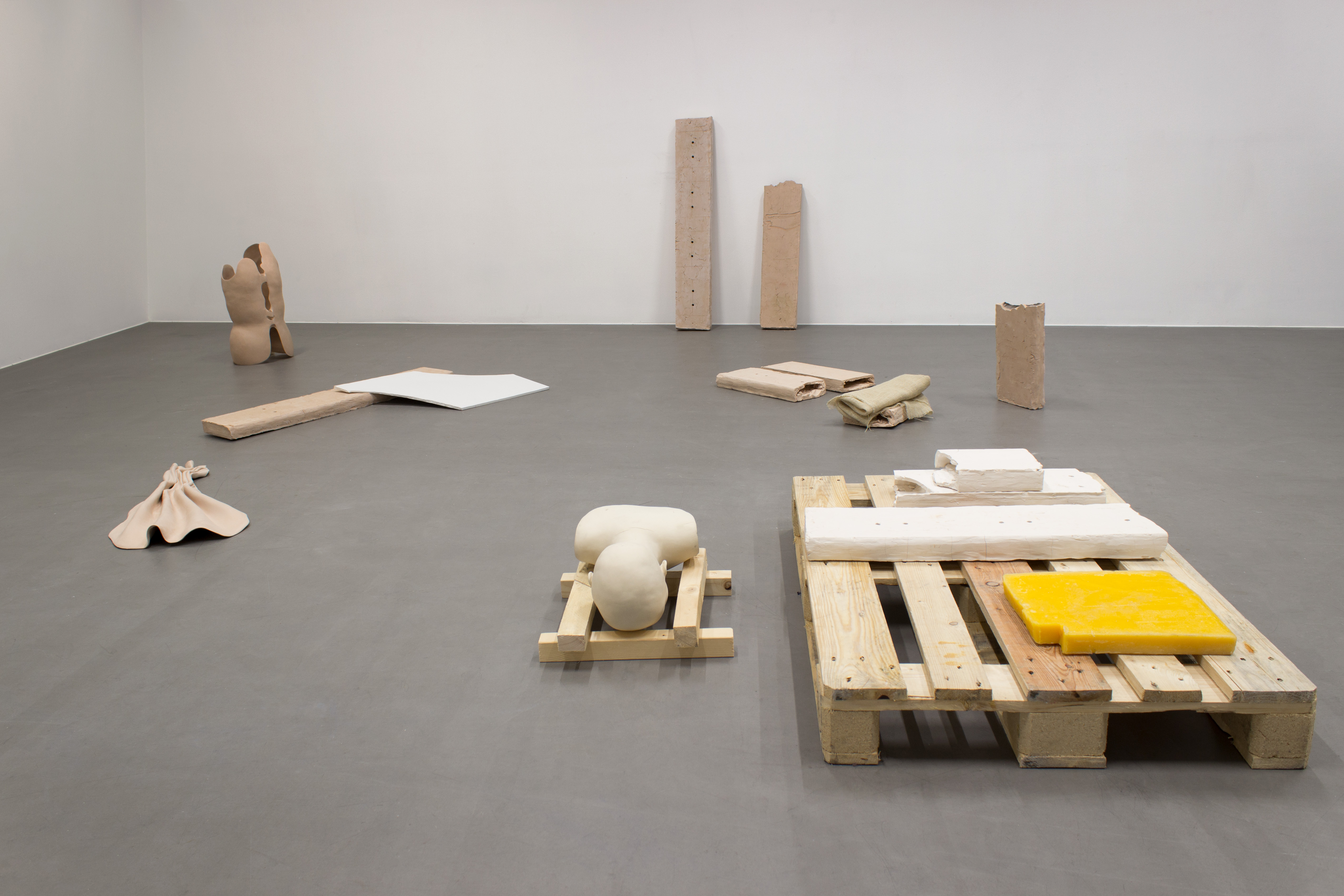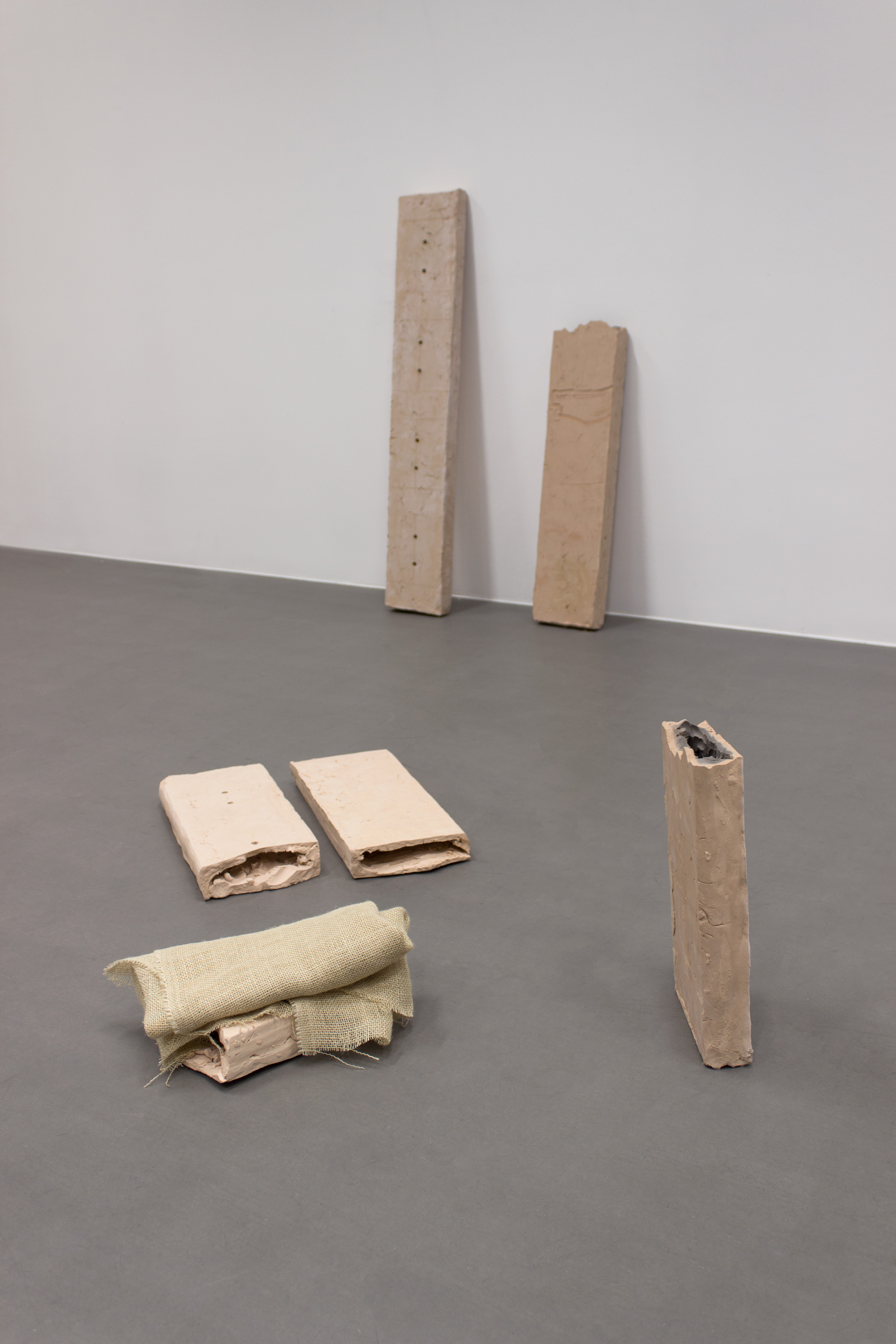Clay fragments with darkened inside from firing and burlap, installation and collaboration with Linda Morell